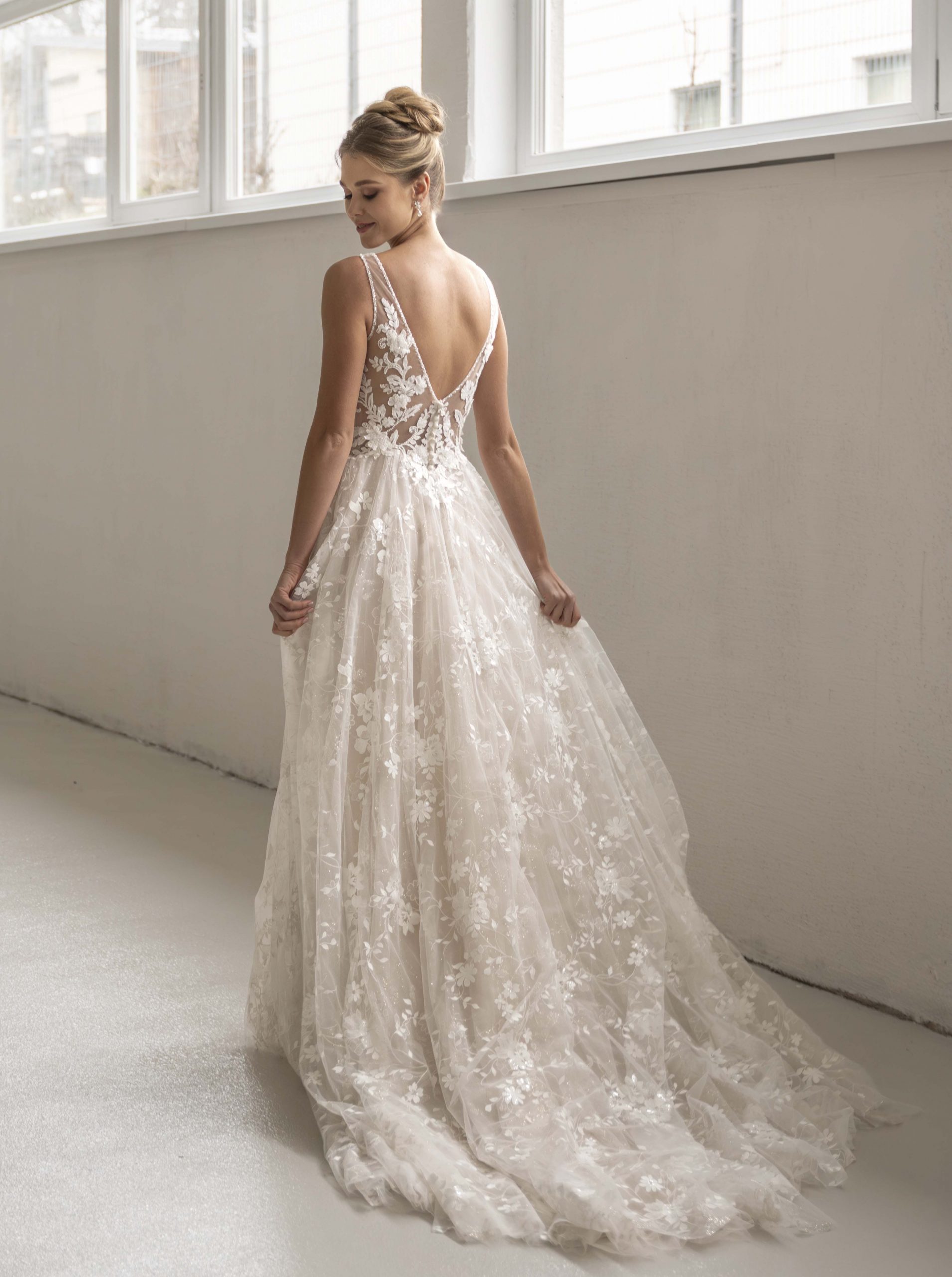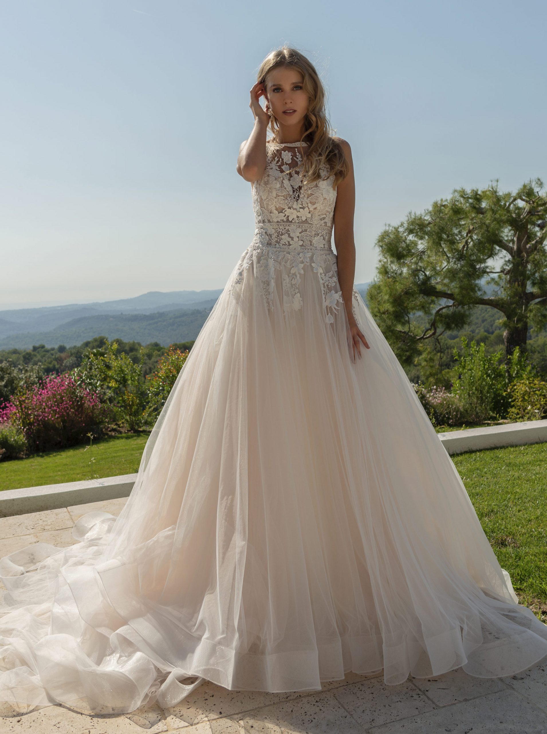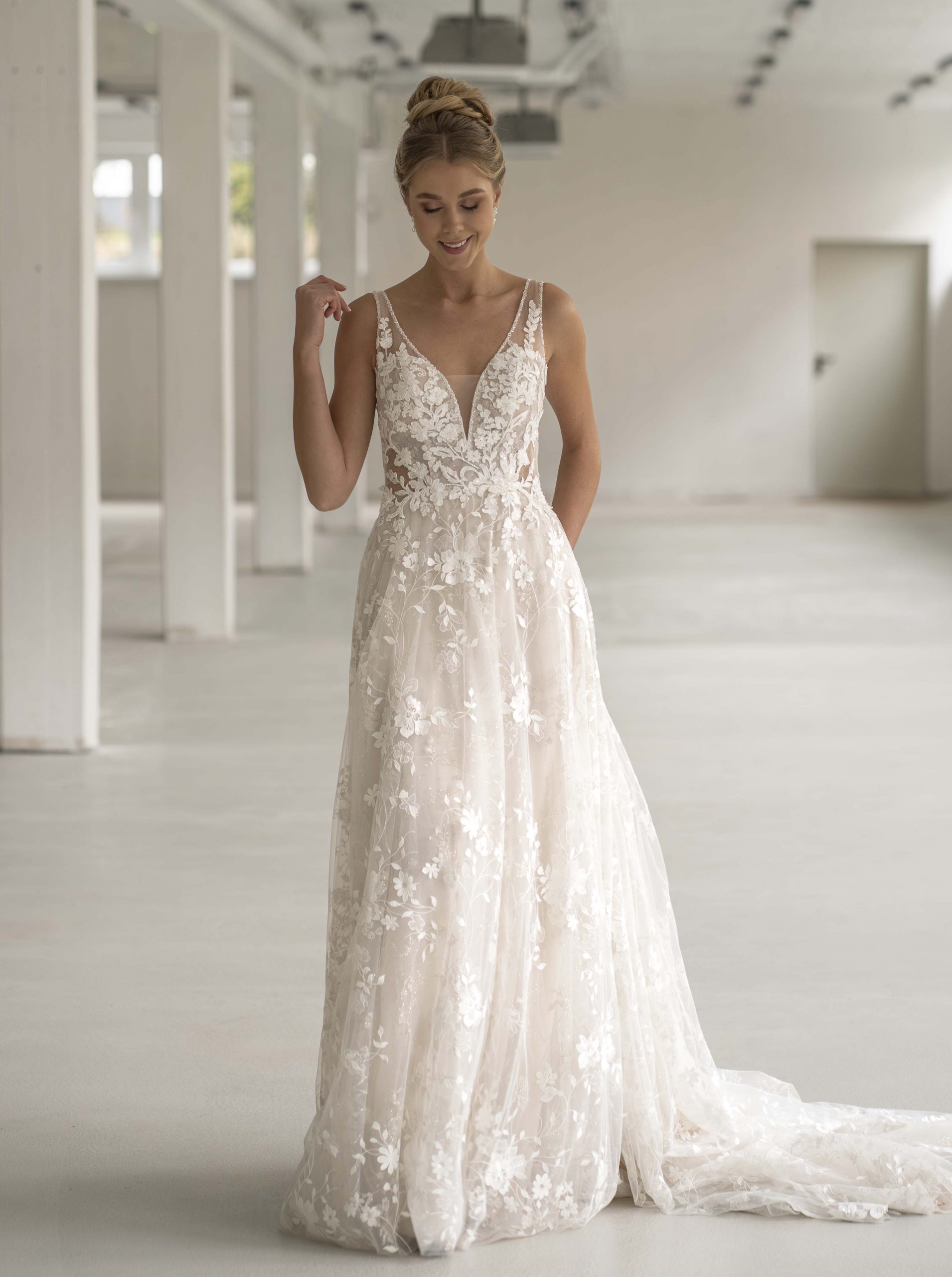 Berauschend schöne romantische Schnitte, verziert mit Spitzen und floralen Details finden sich in klassischen A-Linien und Prinzessinnenkleider wieder.